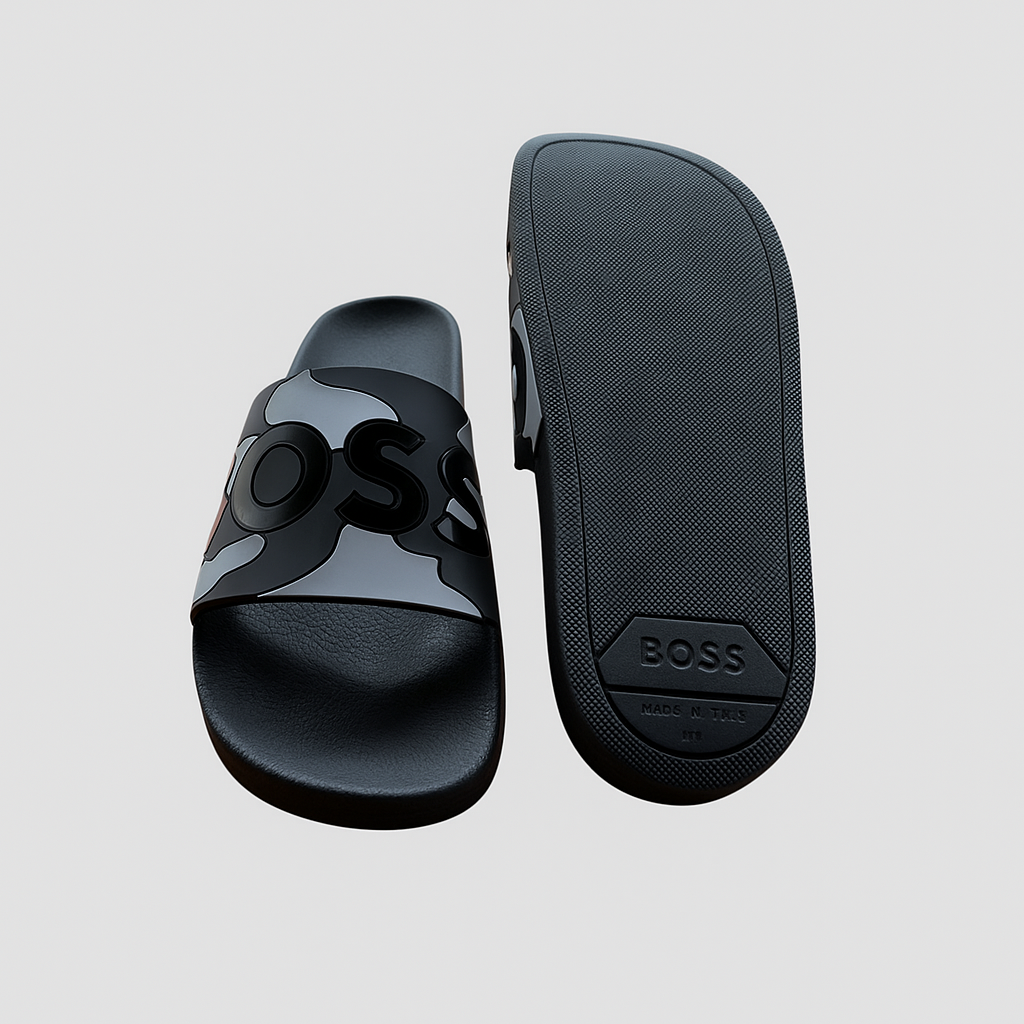 Sandalia Boss en color negro con detalle en camuflaje de la mejor calidad.