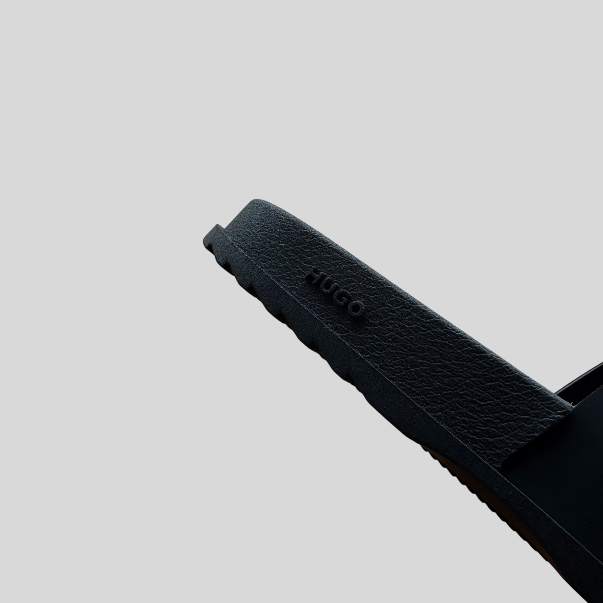 Sandalia Hugo en color negro con detalle en relieve rojo de la mejor calidad.